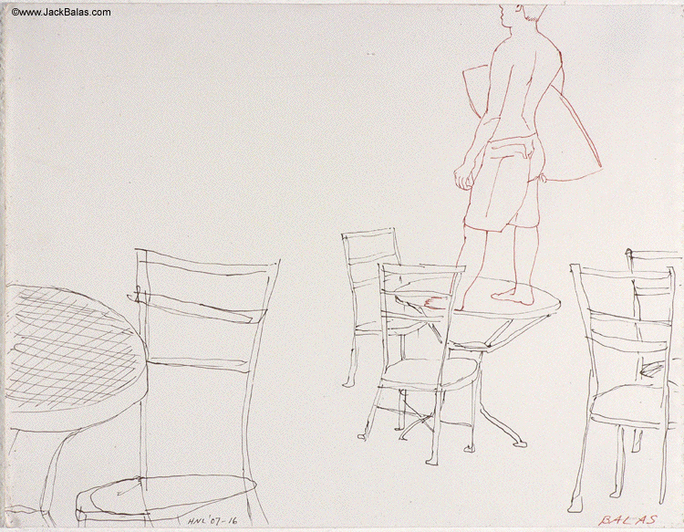 Jack Balas, 2007; Honolulu Drawing #16: Untitled (Tabletop Surfer #2); ink on paper, approx. 9" x 12"