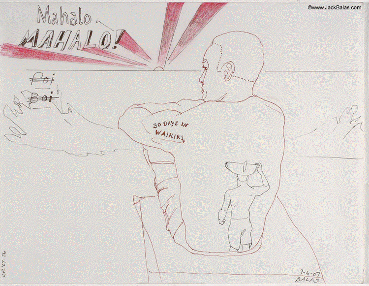Jack Balas, 2007; Honolulu Drawing #26: MAHALO; ink and colored pencil on paper, approx. 9" x 12"