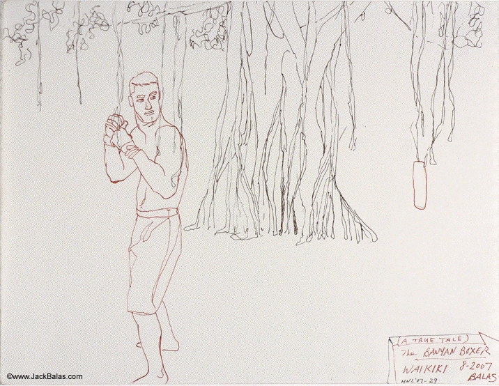 Jack Balas, 2007; Honolulu Drawing #29: THE BANYAN BOXER; ink on paper, approx. 9" x 12"