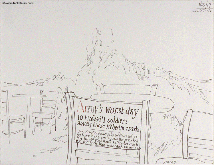 Jack Balas, 2007; Honolulu Drawing #40: ARMY'S WORST DAY; ink on paper, approx. 9" x 12"