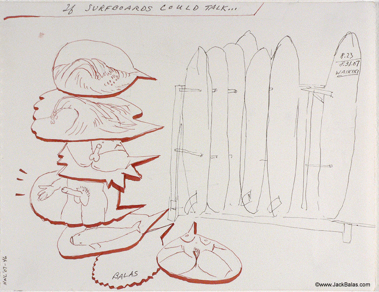 Jack Balas, 2007; Honolulu Drawing #46: IF SURFBOARDS COULD TALK; ink on paper, approx. 9" x 12"