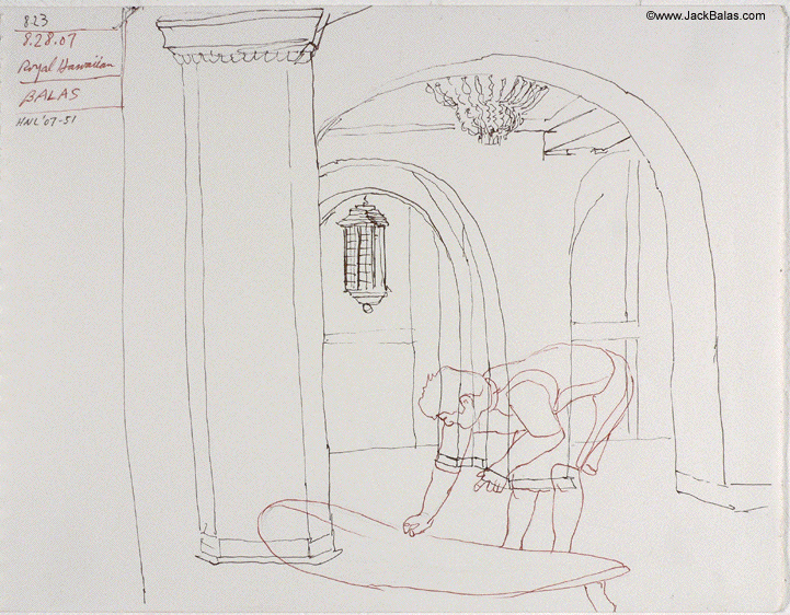 Jack Balas, 2007; Honolulu Drawing #51 Untitled (Royal Hawaiian Lobby #2); ink on paper; approx. 9" x 12"