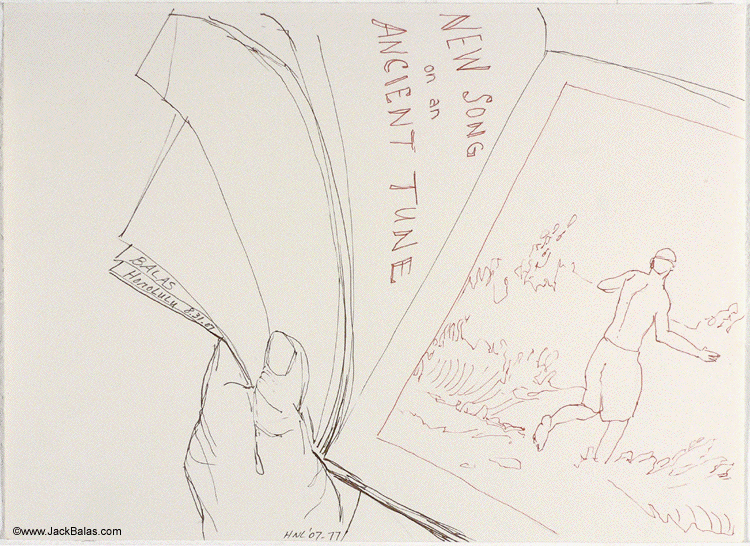 Jack Balas, 2007; Honolulu Drawing #77: NEW SONG ON AN ANCIENT TUNE; ink on paper; approx. 9" x 12"