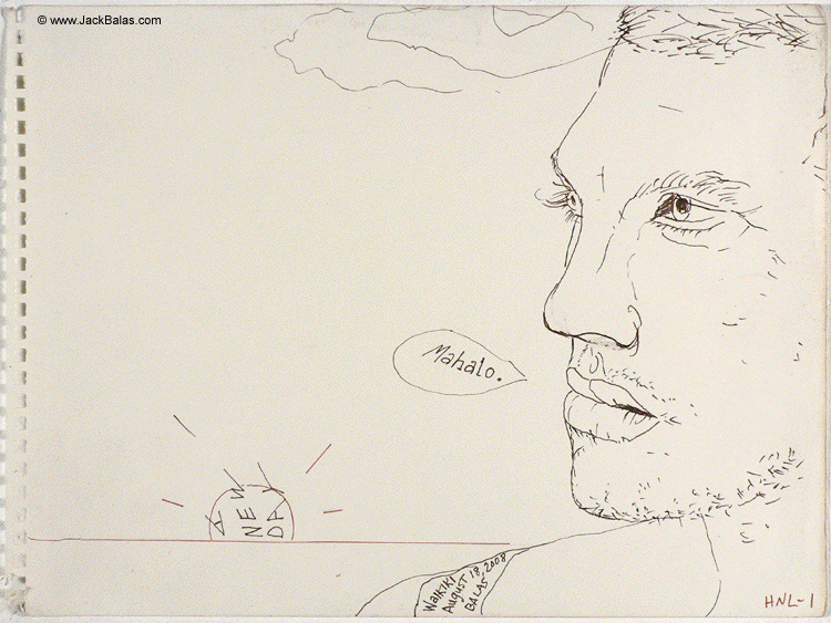 Jack Balas, 2008; Honolulu Drawing # 1 A NEW DAY (MAHALO); ink on paper, approx. 9" x 12"