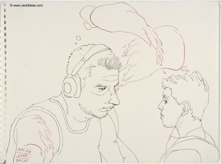 Jack Balas, 2008; Honolulu Drawing #26, Untitled (headphones wave bubbles); ink on paper, approx. 9" x 12"
