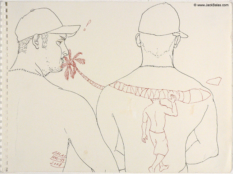 Jack Balas, 2008; Honolulu Drawing #49, Untitled (palm carrier); ink on paper, 9" x 12"