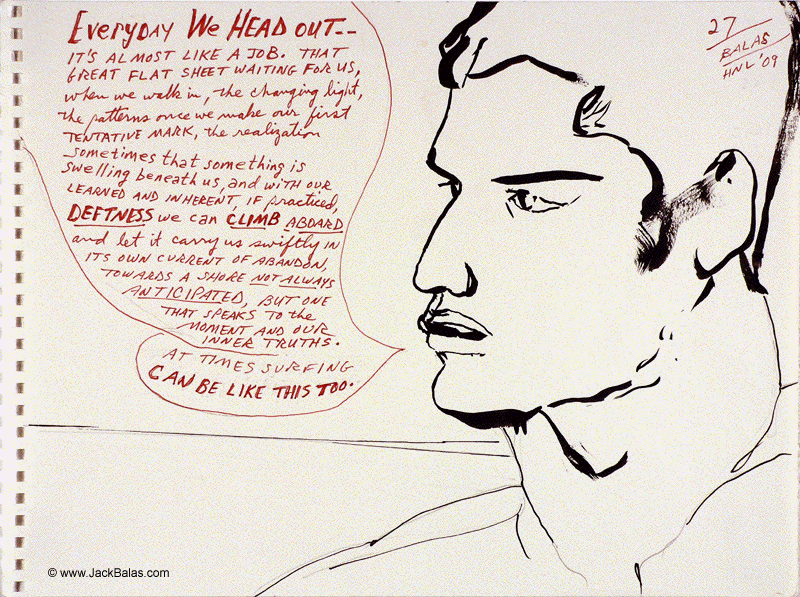 Jack Balas, 2009; Honolulu Drawing #27; SURFING CAN BE LIKE THIS TOO; ink on paper; 9" x 12"