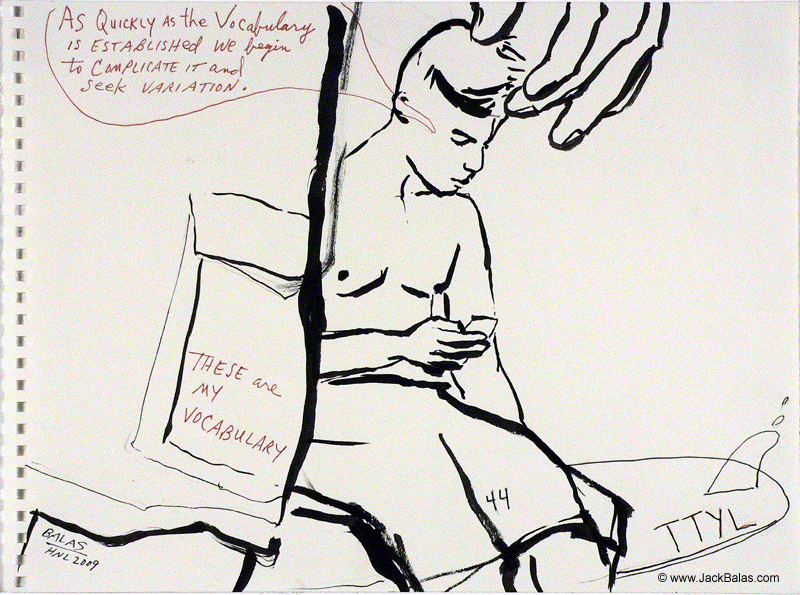 Jack Balas, 2009; Honolulu Drawing #44, MY VOCABULARY; ink on paper, 9" x 12"