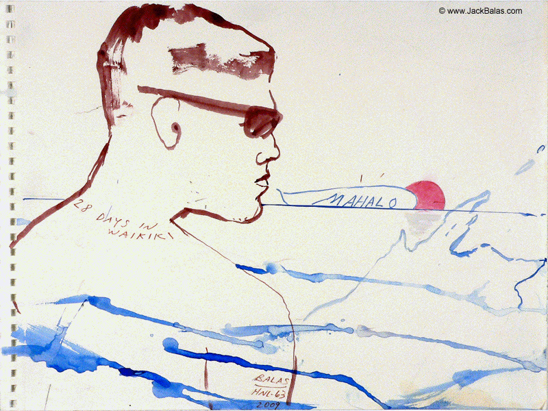 Jack Balas, 2009; Honolulu Drawing #63; 28 DAYS IN WAIKIKI, MAHALO; ink on paper, 9" x 12"
