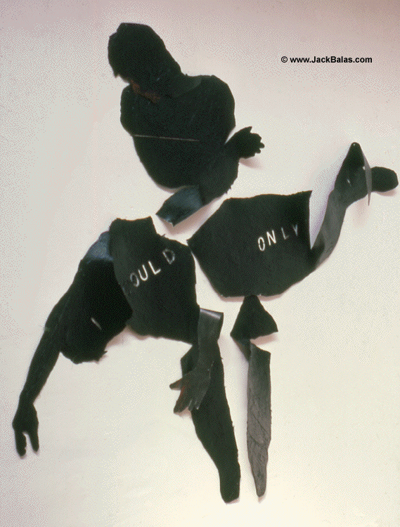 Jack Balas, 1981, I COULD ONLY CRY; roofing tar on cut canvas pieces, cut-out lettering; 71" x 80"