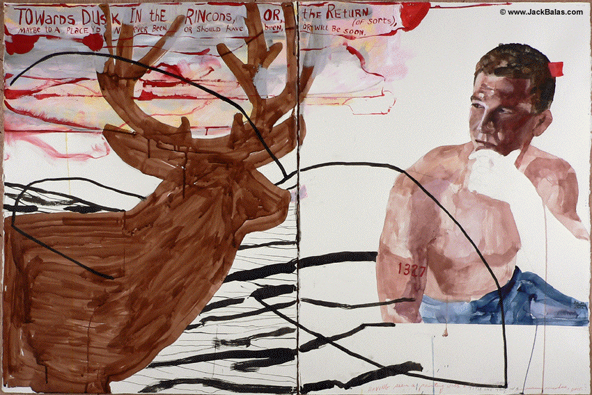 Jack Balas, 2016; TOWARDS DUSK IN THE RINCONS (#1327); watercolor, ink, acrylic and pencil on 2 paper panels, 30" x 45" overall