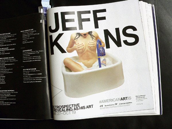 In the 2014 ad for the Whitney's Jeff Koons Retrospective, Koons's "Woman in Tub" makes an appearance from the collection of the Art Institute of Chicago (see ad below). In the MUSE paintng here, this naked man in a shower sports the curatorial wall text from the Art Institute, on his body much like a tattoo. The large J, K and S that have been reproduced in the painting from the ad, are the three letters Jeff Koons and Jack Balas share in their names.