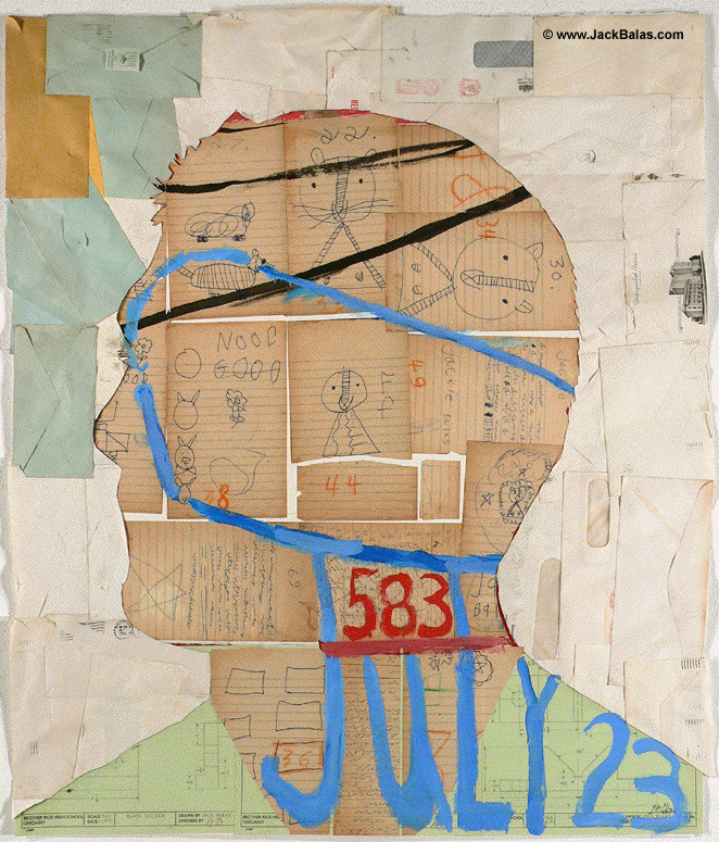 Jack Balas, 2011; JULY 23 (#583); acrylic on collage of envelopes and childhood drawings; 37.5" x 31.5"