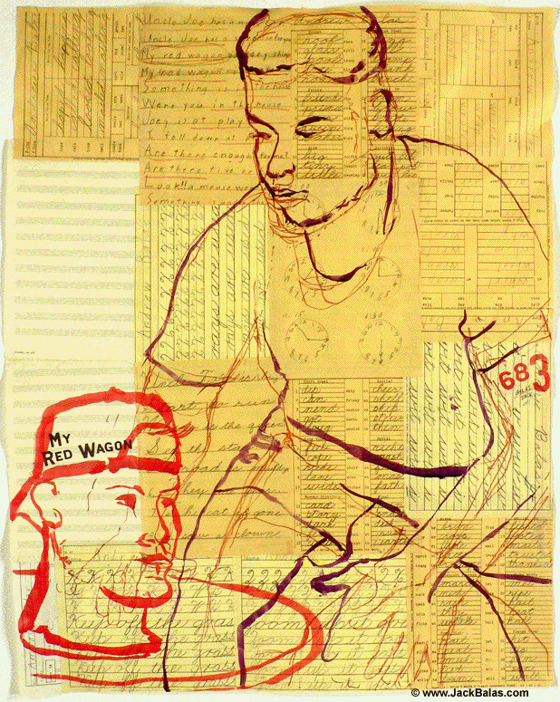 Jack Balas, 2011; MY RED WAGON (#683); ink on collaged 1960's school papers, 38.5" x 31"