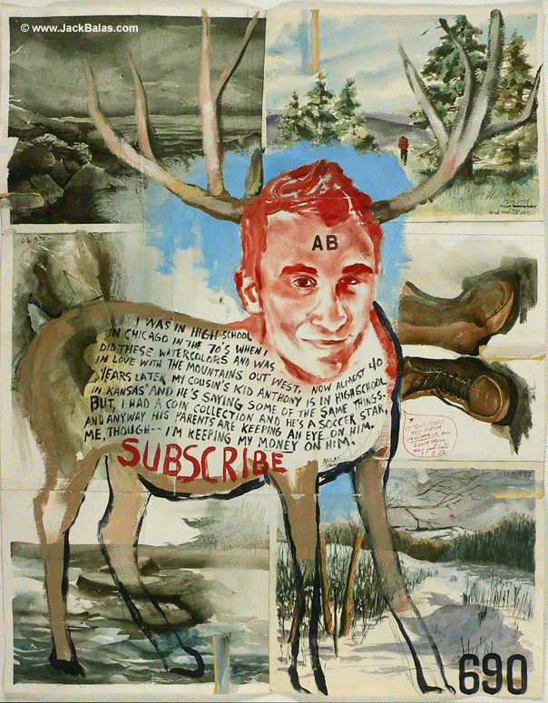 Jack Balas, 2011; SUBSCRIBE (ANTHONY) (#690); oil and acrylic on collage of 1970's watercolors on paper; 35" x 28"