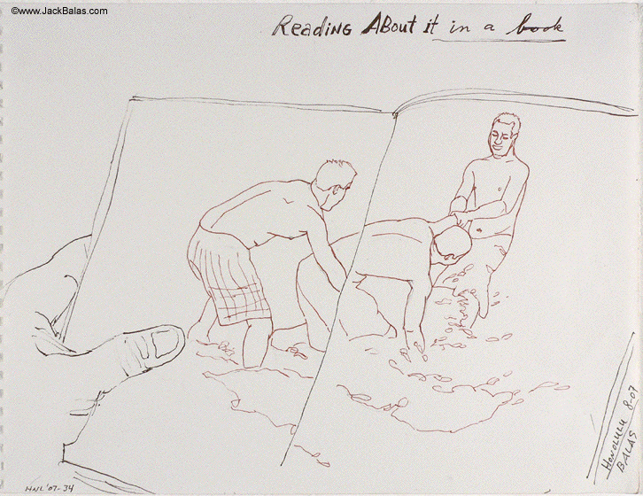Jack Balas, 2007; Honolulu Drawing #34, READING ABOUT IT IN A BOOK; ink on paper; approx. 9" x 12"