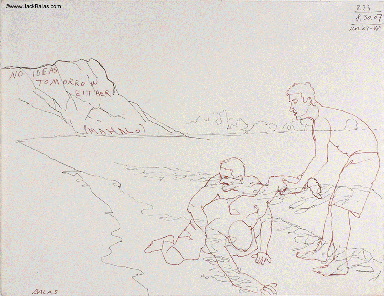 Jack Balas, 2007; Honolulu Drawing #48: NO IDEAS TOMORROW EITHER; ink on paper, approx. 9" x 12"