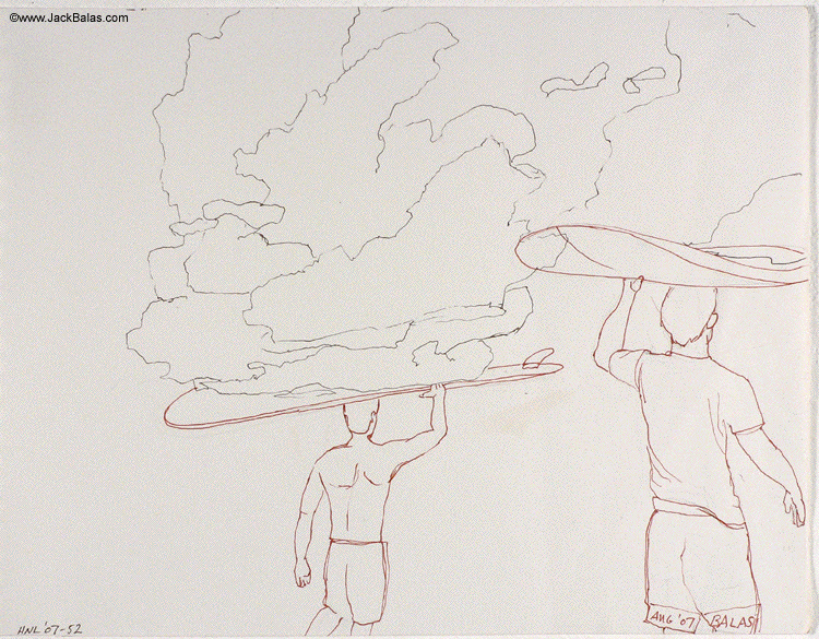 Jack Balas, 2007; Honolulu Drawing #52: Untitled (Surfboards & Clouds); ink on paper, approx. 9" x 12"