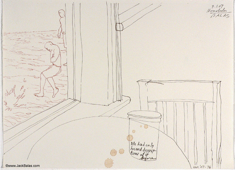Jack Balas, 2007; Honolulu Drawing #76, DESCRIPTIONS OF IT; ink on paper, approx. 9" x 12"