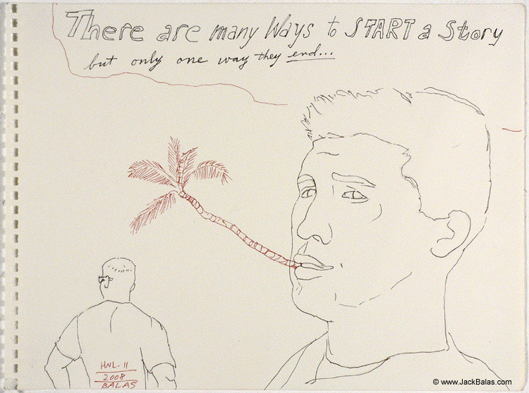 Jack Balas, 2008; Honolulu Drawing #11, THERE ARE MANY WAYS TO START A STORY; ink on paper, approx. 9" x 12"