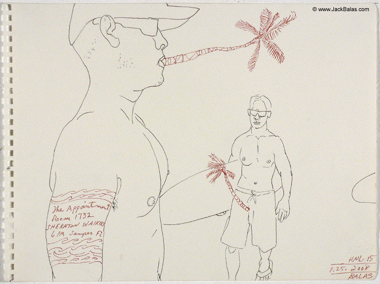 Jack Balas, 2008; Honolulu Drawing # 15, THE APPOINTMENT; ink on paper; approx. 9" x 12"