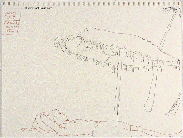 Jack Balas, 2008; Honolulu Drawing # 17, Untitled (grass umbrella); ink on paper; approx. 9" x 12"