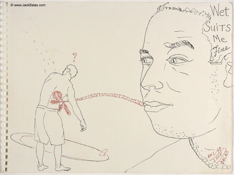 Jack Balas, 2008; Honolulu Drawing #48, WET SUITS ME FINE; ink on paper, approx. 9" x 12"