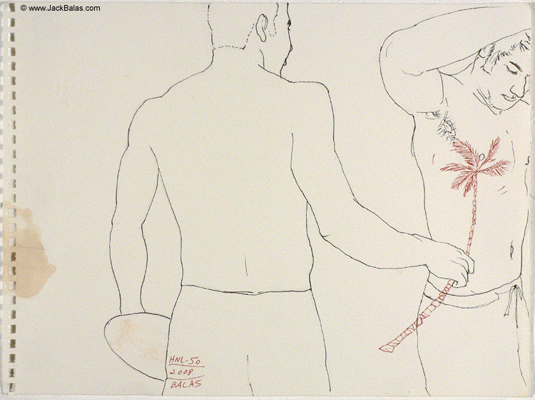 Jack Balas, 2008; Honolulu Drawing # 50, Untitled (palm, football); ink on paper; approx. 9" x 12"