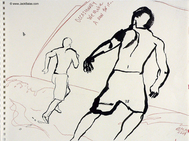 Jack Balas, 2009; Honolulu Drawing #38, WE MAKE A RUN FOR IT; ink on paper, 9" x 12"