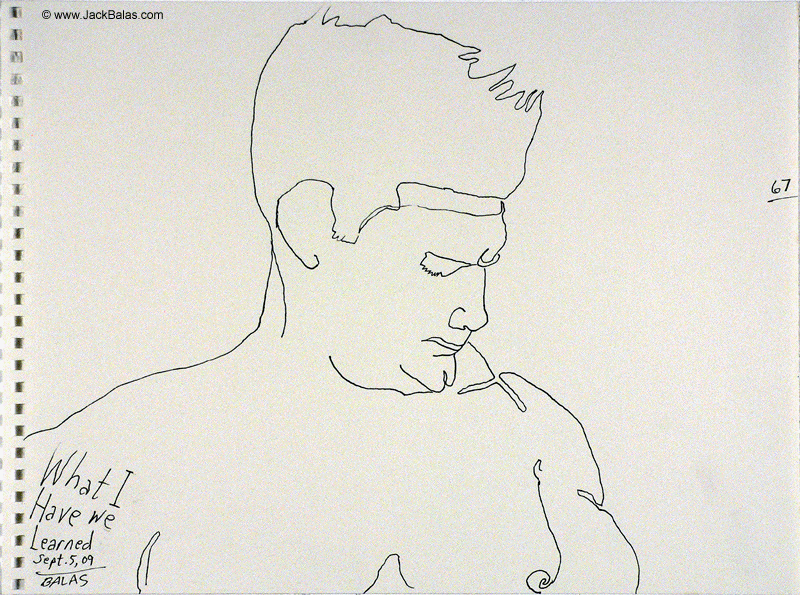 Jack Balas, 2009; Honolulu Drawing #67: WHAT I HAVE WE LEARNED; ink on paper, 9" x 12"