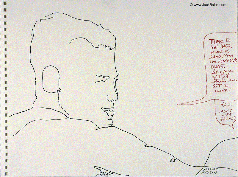 Jack Balas, 2009; Honolulu Drawing #68; AIN'T LIFE GRAND?; ink on paper, 9" x 12"