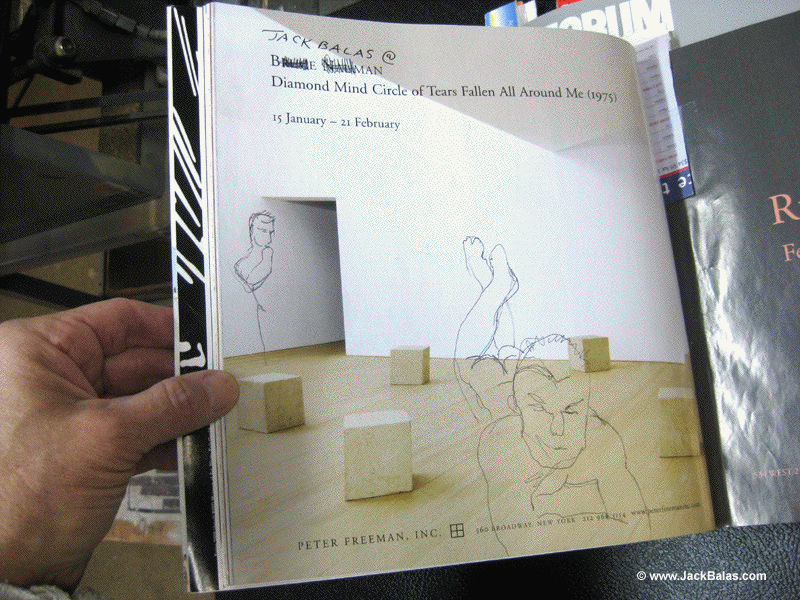 Jack Balas, 2009; JACK BALAS @ BRUCE NAUMAN; ink on magazine page, ArtForum, February 2009