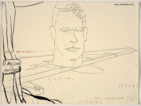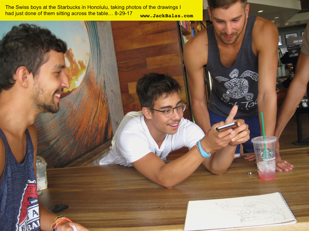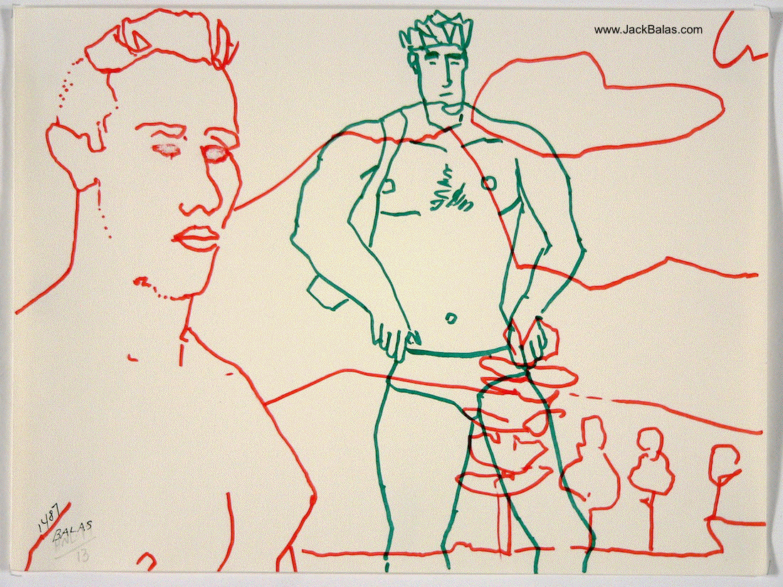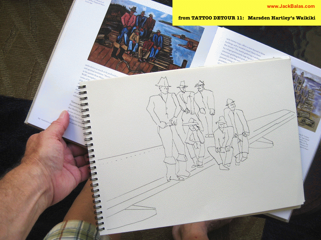 TATTOO DETOUR: 11 MARSDEN HARTLEY'S WAIKIKI Normally when traveling I've been content to walk around, explore and take photos while visiting art museums and galleries -- a method that works fine in New York or Paris when you're there for a week or so. But finding myself in Honolulu for an extended stay in 2007, I realized that Waikiki is a different animal altogether, relentless as it is with the shirtless men who are my muse, not only on the beach but in the restaurants, grocery stores, hotel lobbies, even on the bus. So I was tempted to go further than my normal mode and try to have a studio at the same time, namely a sketchpad and a handful of pens I was carrying around, creating a body of work out of a suitcase while living in a hotel room. Drawing on the aforementioned beaches, and in the same restaurants and hotel lobbies, I was able to enjoy a completely different rythmn of work than I've ever known at home, at the same time surrounded by people who occasionally wandered over to look at what I was up to so long at my favorite Starbuck's table or on some bench in Kapiolani Park, or under a palm tree. And the setting of an extreme tourist spot such as Waikiki posed the enjoyable task of trying to reach beyond the predictable cliches of surfers, babes and palms. The resulting drawings are conflations of those very surfers, palms, tattoos, military guys, pigeons, lobby furniture, waves and restaurant tables, offering intersections between the surf of Hockney, Picabia, Pettibon, Guston and Westermann, fact and fiction. As I did in 2015 when I took comic character Dennis the Menace to Honolulu to help out with the drawings, in 2017 I've brought along American painter Marsden Hartley (1877-1943) to inform the body of work, inspired by my research of Hartley's own work in preparation for my solo painting show at the University of Maine Museum of Art in Bangor. Some drawings capture Hartley's image from historic photographs, while others quote figures from some of his paintings, while still others use his landscape images as settings for a select cadre of Waikiki surfers. Enjoy! |
