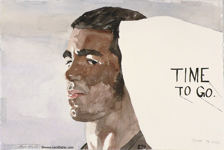 Jack Balas, 2007; TIME TO GO; watercolor and ink on paper; 15" x 23"