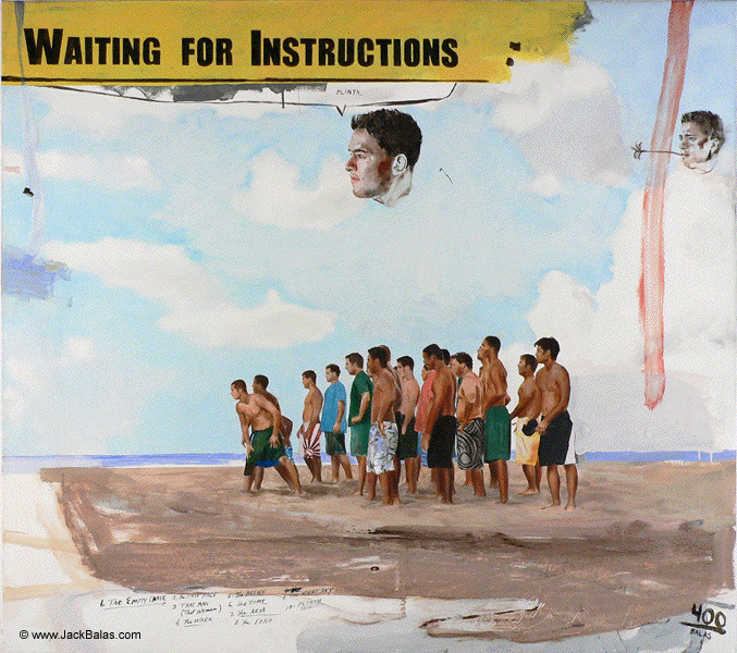 Jack Balas, 2008; WAITING FOR INSTRUCTIONS (PLINTH) (#400); oil, enamel and ink on canvas; 48" x 54"