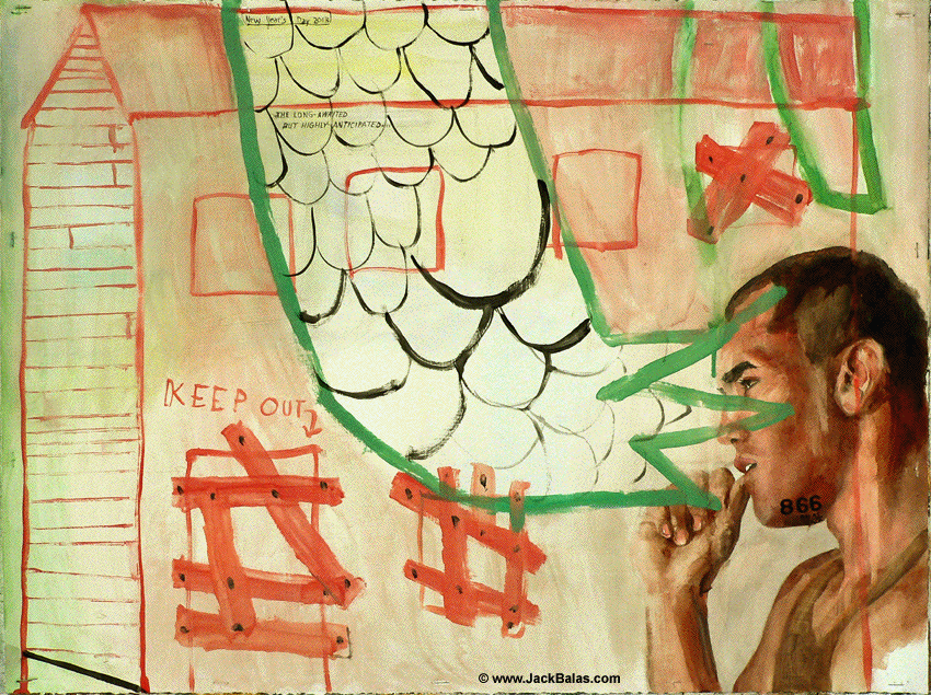 Jack Balas, 2013; KEEP OUT (#866); oil on paper, 22" x 30"