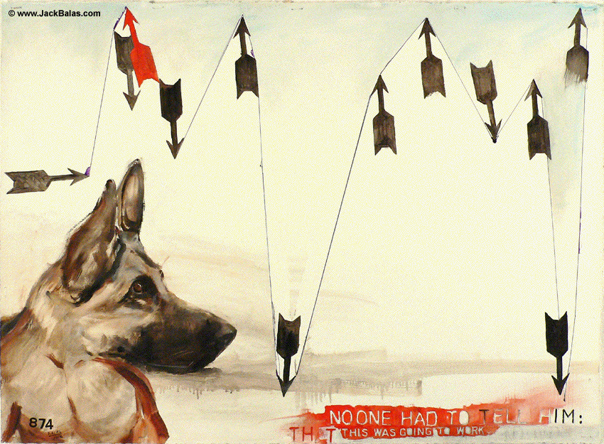 Jack Balas, 2013; NO ONE HAD TO TELL HIM (# 874); oil and ink on gessoed paper, 22" x 30"
