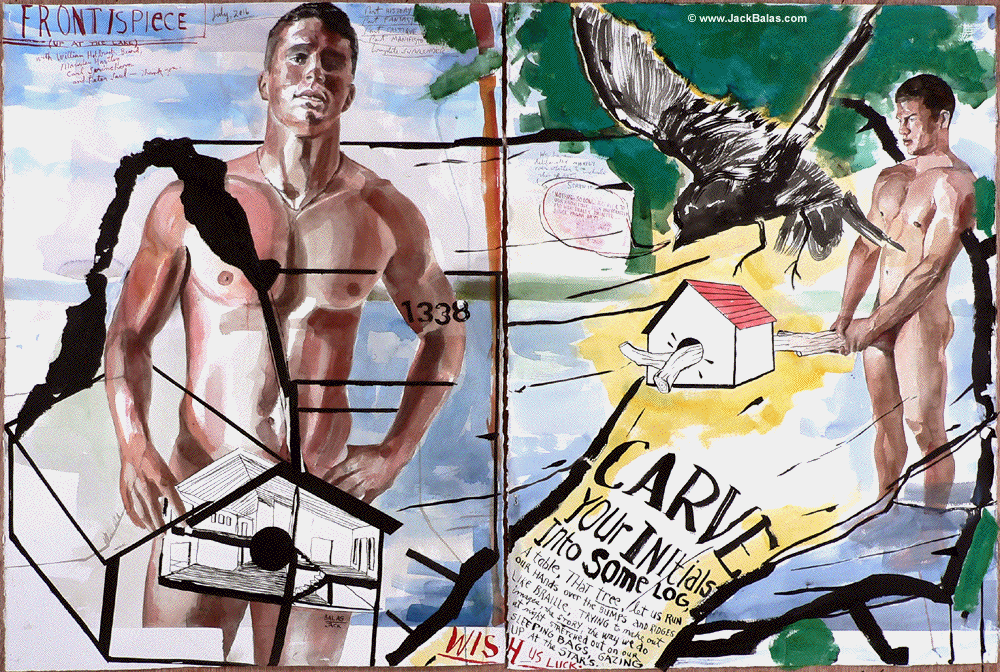 Jack Balas, 2016; FRONTISPIECE (UP AT THE LAKE) (CARVE YOUR INITIALS...) (#1338); watercolor, ink & acrylic on 2 paper panels, 30" x 45" overall.