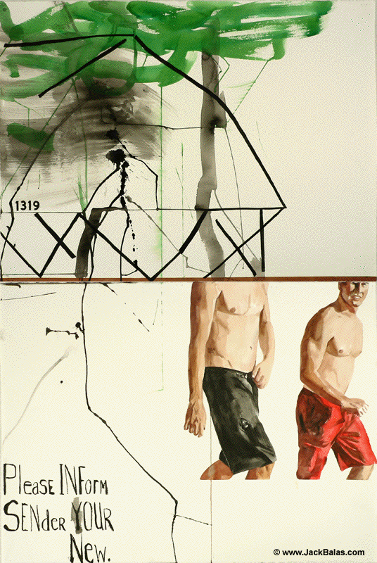 Jack Balas, 2016; PLEASE INFORM SENDER (#1319); watercolor, ink & acrylic on 2 paper panels, 45" x 30" overall