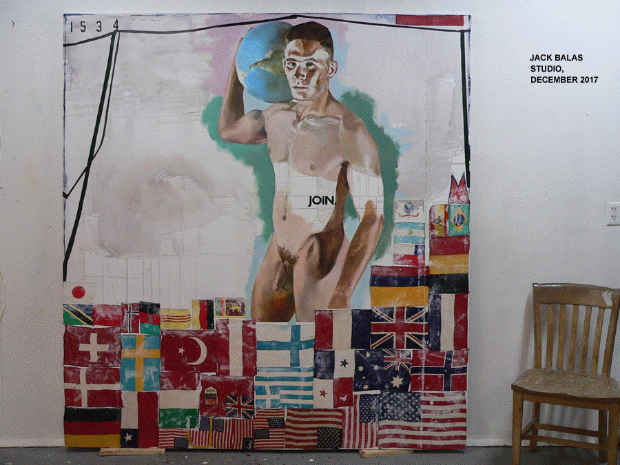 Jack Balas with JOIN (#1534) in progress in the studio. Oil on canvas, 84" x 78", with collage of cotton flags along the bottom.
