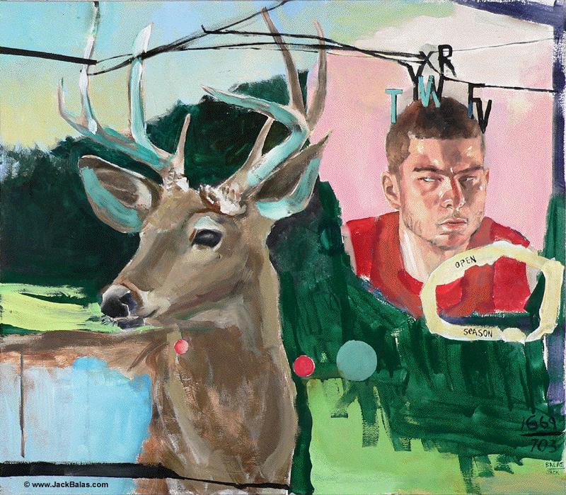 Jack Balas, 2018; OPEN SEASON (#703, 1669); oil and enamel on canvas, 28" x 32"