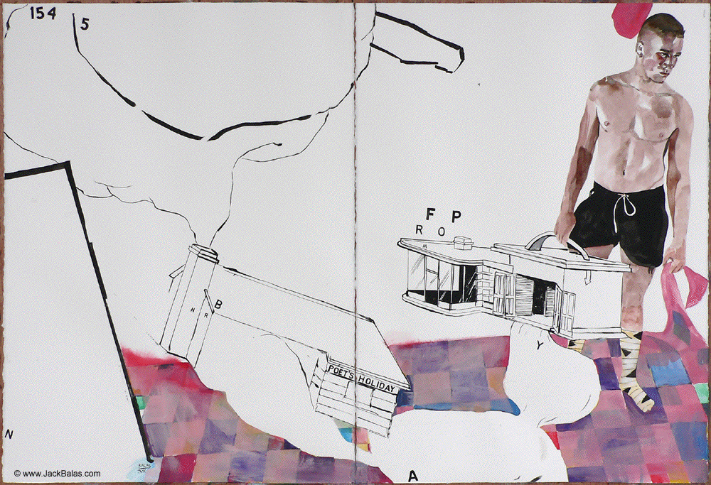 Jack Balas, 2018: POET'S HOLIDAY (#1545); watercolor, ink and acrylic on 2 paper panels, 30" x 45" overall