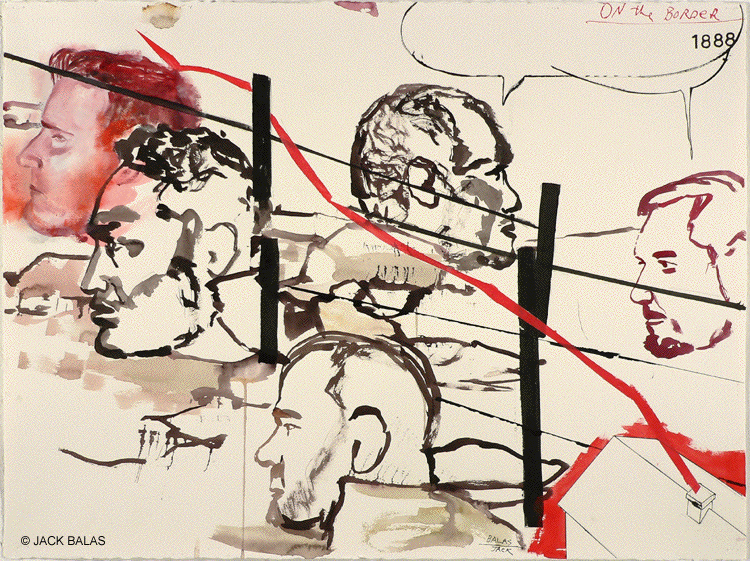 Jack Balas, 2020; ON THE BORDER (#1888) India ink on paper, 22x30 inches.