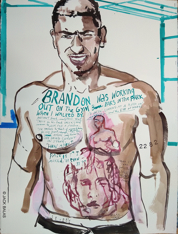 Jack Balas, 2022; BRANDON ON THE GYM BARS (#2282); India ink on paper, 30x22 inches