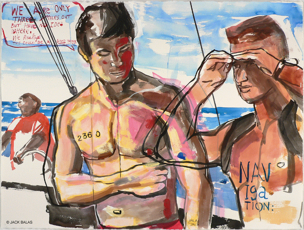 Jack Balas, 2022; NAVIGATION (#2360); India ink on paper, 22x30 inches Text: We are only three miles out but have no idea where. We realize this could be a good thing.