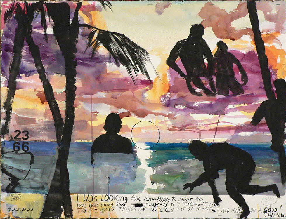Jack Balas, 2022; OUT OF HAND (#2366); India ink & acrylic on paper, 22x30 inches text: I was looking for something to paint and Wes was doing some sunsets, so I thought I'd try my hand. Things got quickly out of hand. This may be a good thing.