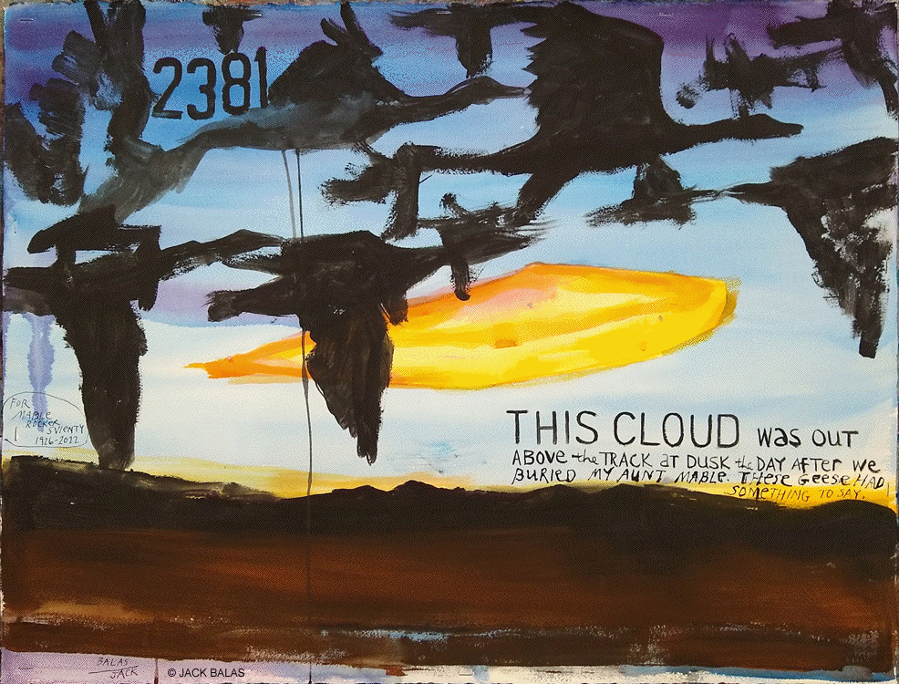Text: THIS CLOUD WAS OUT ABOVE THE TRACK AT DUSK THE DAY AFTER WE BURIED MY AUNT MABLE. THESE GEESE HAD SOMETHING TO SAY.