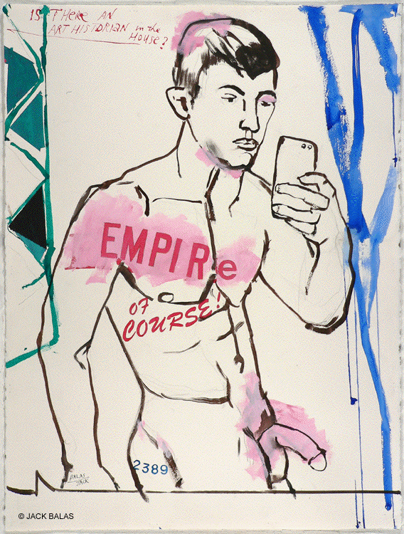 Jack Balas, 2023; EMPIRE OF COURSE! (#2389) (For Thomas Cole); India ink & acrylic on paper, 30x22 inches additional text: IS THERE AN ART HISTORIAN IN THE HOUSE?
