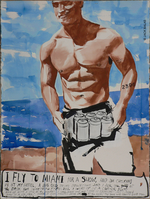 Jack Balas, 2023 text: I fly to Miami for a show, and am checking in at my hotel, a big old thing downtown, and I ask the guy at the desk for something fabulous. I wind up in a corner suite high up with a view of the ocean! I call down and say "This is FABULOUS! All I need now is a six pack." Damn if five minutes later he's at the door. The beer was pretty good too. |