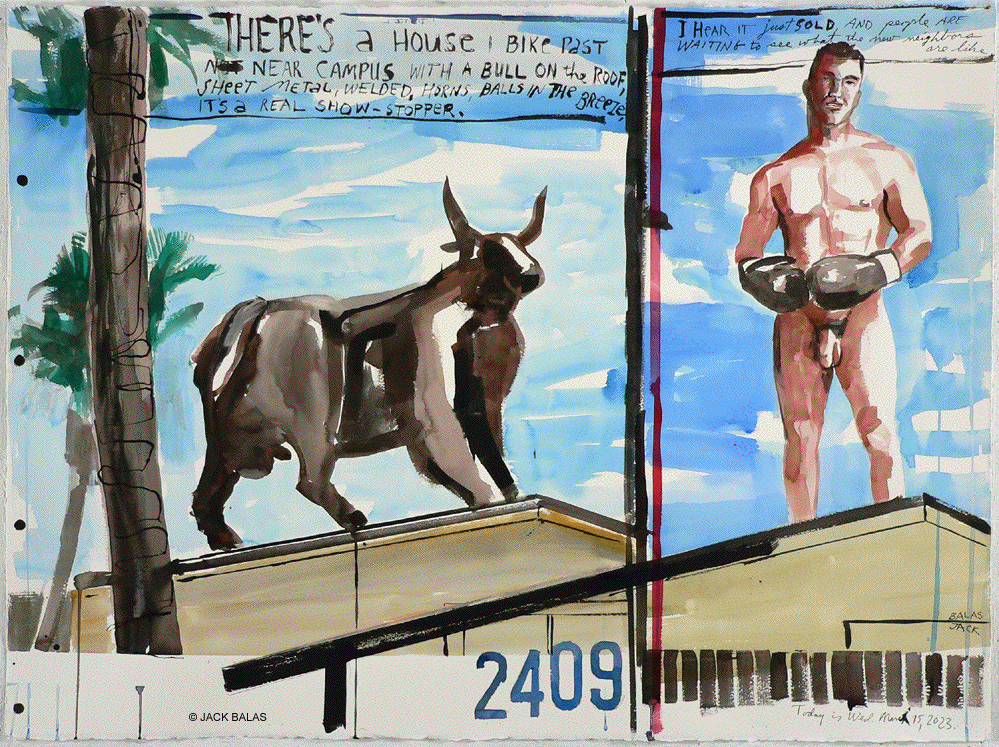 Jack Balas, 2023; BULL ON THE ROOF (#2409); India ink on paper, 22x30 inches